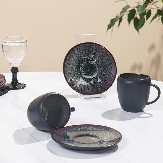 The Karaca Galactic 2-Person Black Coffee Cup Set adds a touch of modern design and sleek black color to enhance your coffee experience. Made of ceramic, this set provides a 100 ml capacity, perfect for a coffee experience for two. It includes 2 coffee cups and their matching saucers. Its dishwasher-safe feature makes it easy to clean.