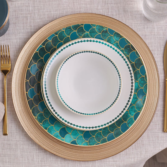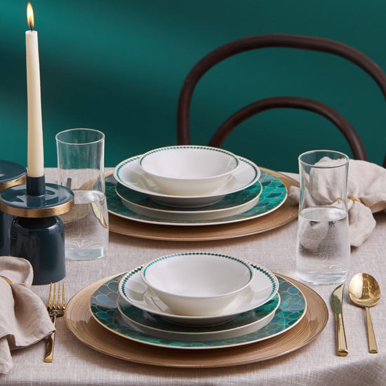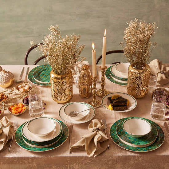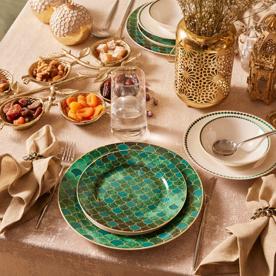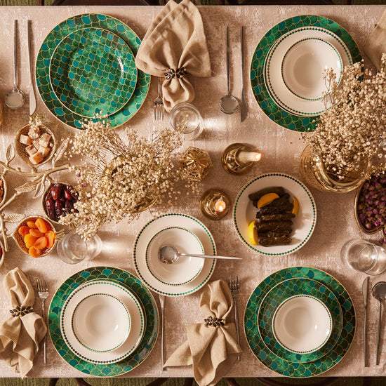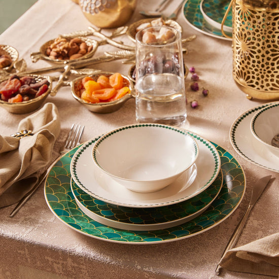 Inspired by the emerald gemstone, symbolizing love and fidelity, the Karaca Zümrüt 6-Person Dinner Set will make your table shine. With its stunning emerald green tones, golden highlights, and unique patterns, the Zümrüt dinner set exudes modern elegance. Perfect for both formal and everyday dining, it adds a touch of sophistication and makes you and your guests feel special. Made from durable porcelain, this 24-piece set includes 6 each of dinner plates, deep plates, dessert plates, and bowls, making it ideal for complete table settings.